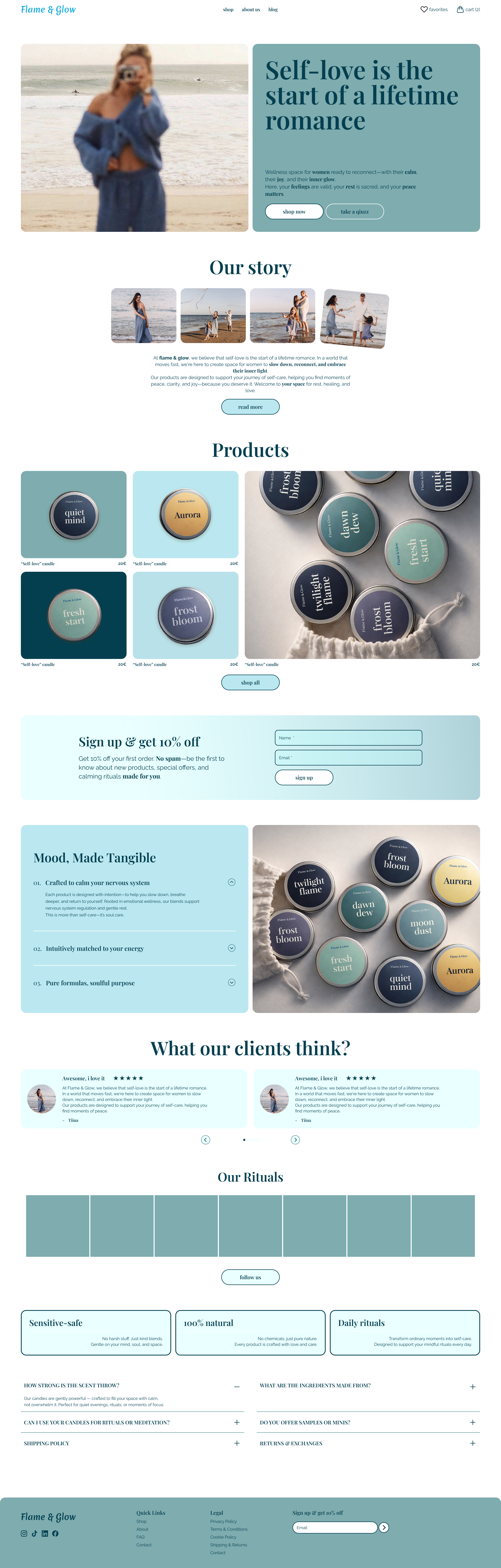 Structure That Supports Ritual and Trust: We organized the information to support the path to a conscious purchase. The “Our Rituals” section explains the brand values (Sensitive-Safe, 100% Natural). A detailed FAQ answers subtle but important questions for the target audience (“How strong is the scent throw?”, “Can I use your candles for rituals?”). This creates transparency and builds trust, showing that the brand understands its audience’s deeper needs.