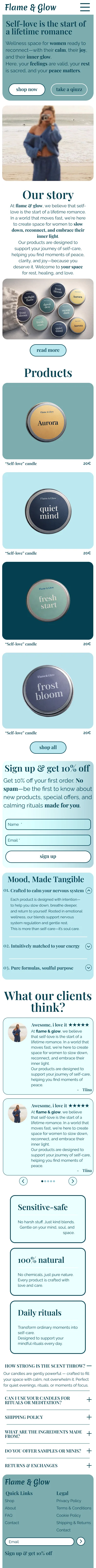 Flame & Glow is more than candles and rituals. It’s a philosophy: “Self-love is the start of a lifetime romance.” However, their initial online presence did not reflect this depth. The brand’s aesthetics, its mission to support emotional state and nervous system, and its intuitive approach to selecting rituals — all required a special digital embodiment. The task was to move away from template e-commerce solutions and create a space that invites you not to buy, but to feel.