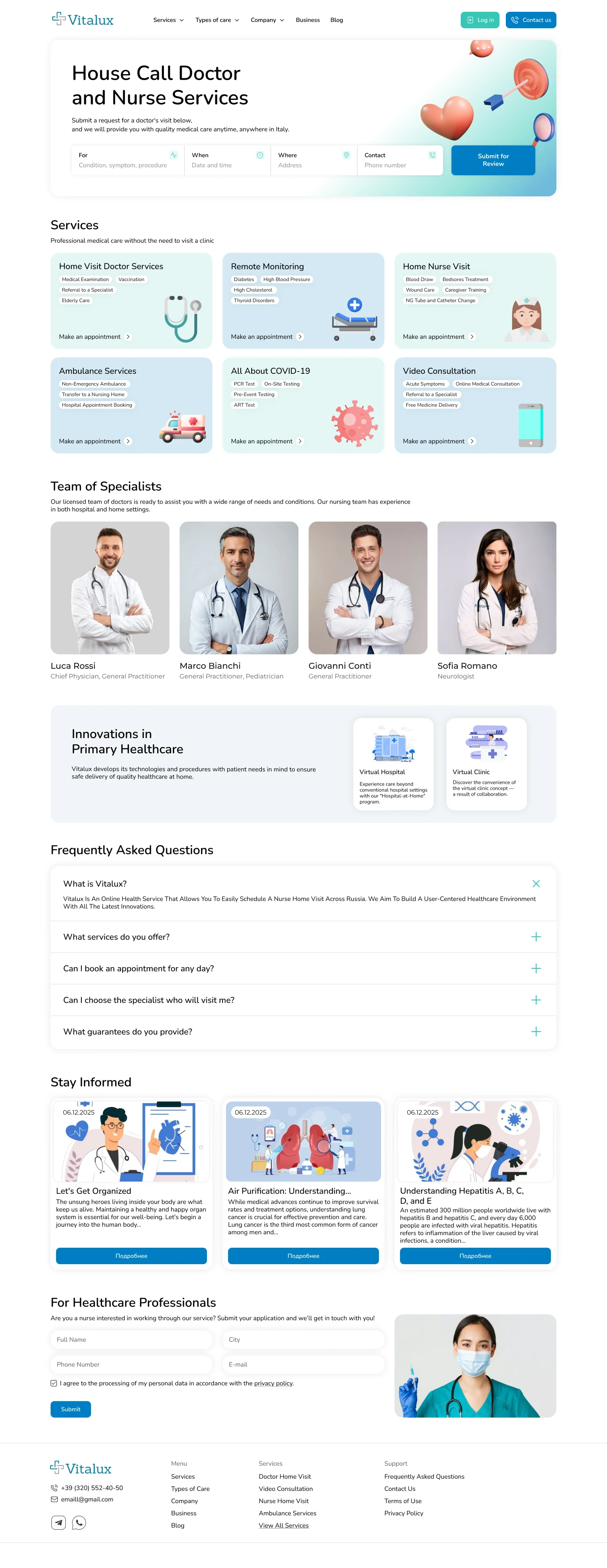 Multi-layered Navigation and Clear Hierarchy: We structured the site around primary user journeys: emergency services (“Ambulance”), scheduled visits (“Doctor/Nurse at Home”), telemedicine (“Video Consultation”), and information (“Blog”, “Team”, “FAQ”). This allows users to quickly find a solution, regardless of the type of request.