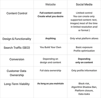 Think of social media as renting a booth at a busy, ever-changing market. You have great visibility, but the landlord (the platform) controls the rules, the audience’s flow, and can evict you or change your rent (algorithm or platform rules) at any time. A website, however, is your owned property. It’s a permanent digital storefront that you fully control. You are not at the mercy of an algorithm deciding not to show your posts or the risk of an account suspension. A website is your stable, secure home base and social media are your outreach channels that should ultimately drive traffic back home.